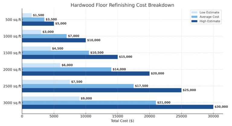 Most people pay between $3 and $8 per square foot for professional refinishing. Costs change based on the floor’s condition, the wood type, the finish, and the space size.